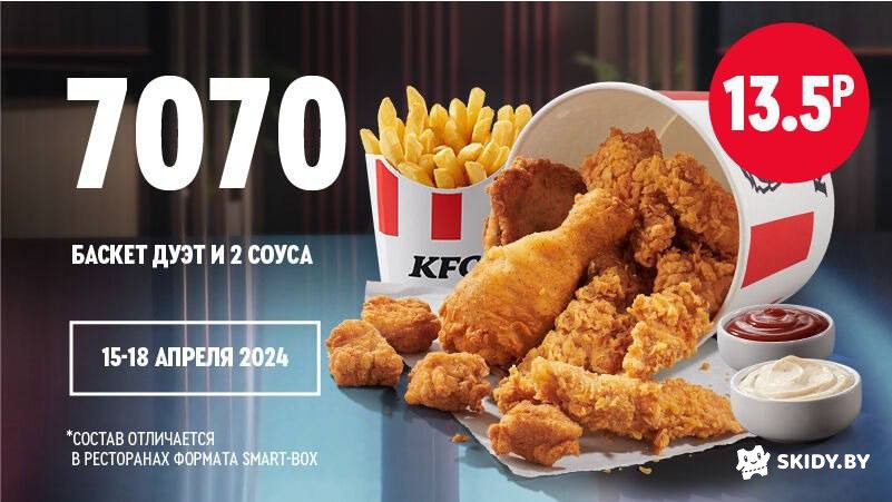 Острые крылышки, сочные ножки, нежные стрипсы, стандартная картошечка фри и 2 соуса за 13,5р. С 15 по 18 апреля набирай в киоске самообслуживания или называй купон 7070 на кассе.