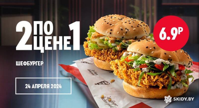 Только сегодня, 24 апреля, забирай 2 шефбургера с сочной курочкой по цене 1 за 6,9р (вместо 13,8р)