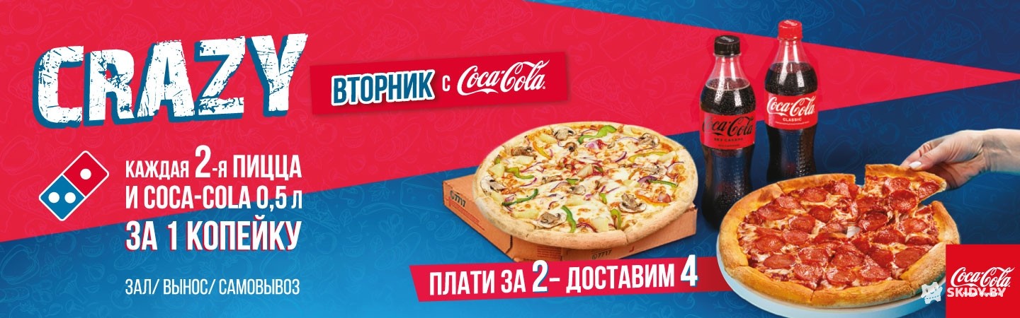 - Акция: Каждая 2-ая пицца и Coca-Cola за 1 копейку