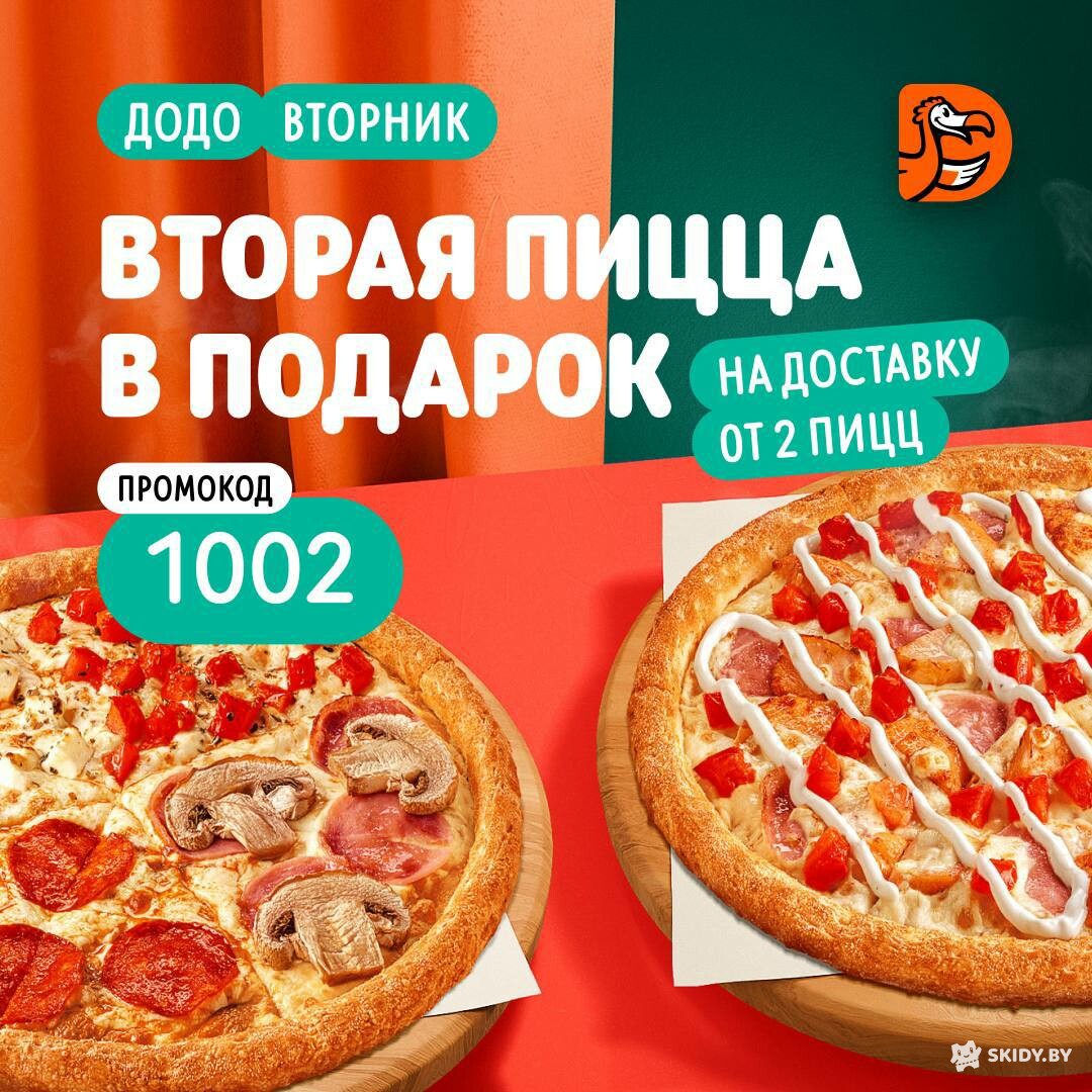Промокод 1002 — для заказа на доставку. Все пиццы размером 30 и 35 сантиметров участвуют, кроме половинок, сытных пицц, Пепперони-сердце, Маргариты, Чоризо фреш, пиццы-конструктора, Сырной, Ветчины и Огурчиков, Итальянского цыплёнка, Ветчины и сыра.