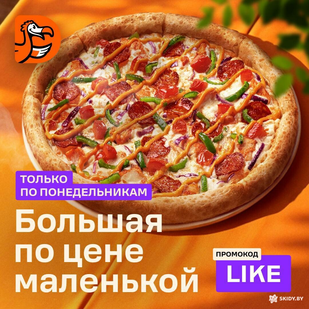 Скидка распространяется на пиццы размером 35 см: «Четыре сезона», «Бургер-пицца», «Гавайская», «Аррива!», «Карбонара», «Деревенская», «Овощи и грибы», «Двойная пепперони», «Мясная», «Цыплёнок барбекю», «Цыплёнок ранч», «Сырный цыплёнок», «Песто», «Пицца Жюльен», «Кантри-пицца», «Баварская», «Бефстроганов», «Додо Микс», «Додо», «Мясной микс с баварскими