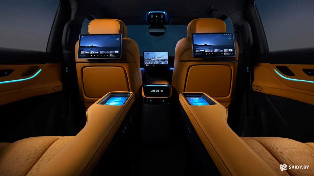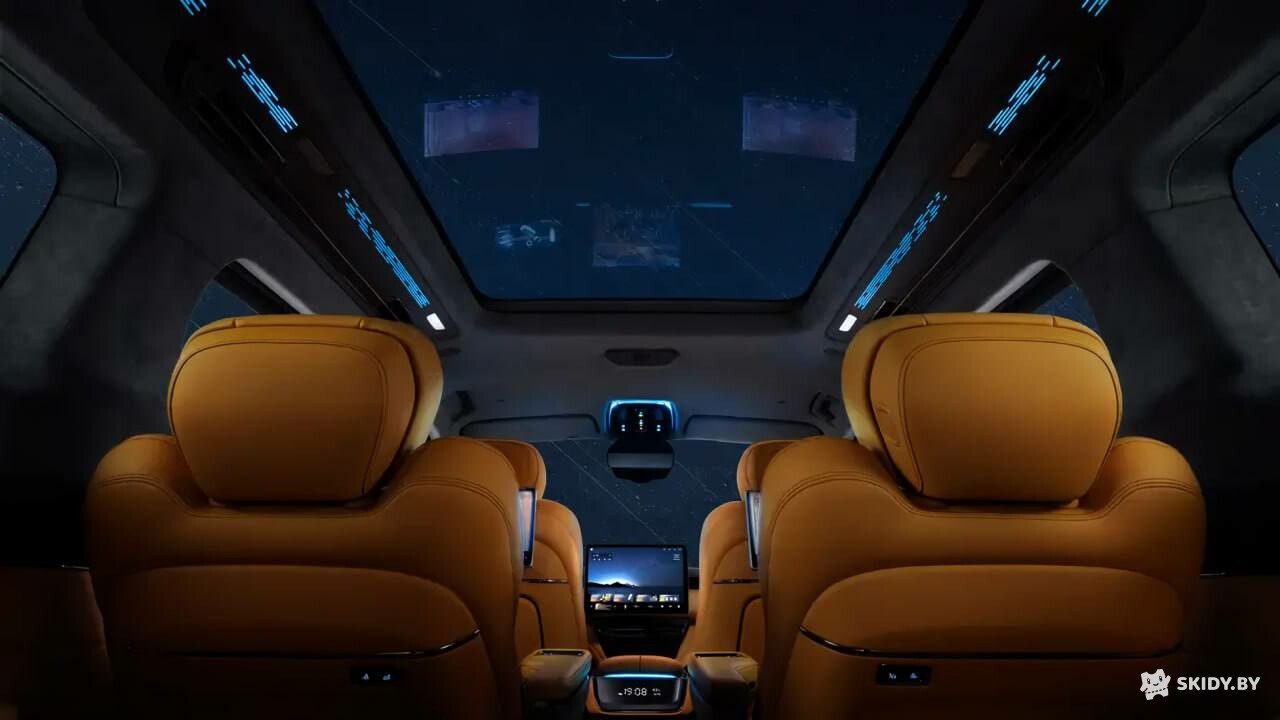 В салоне все по канонам шоу «Тачка на прокачку»: три ряда кресел с вентиляцией и массажем, повсюду дисплеи (!), включая встроенные в подлокотники (!!), а также панорамная крыша. Запас хода — до 825 км.