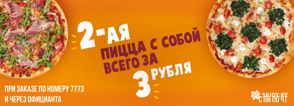 - Акция: Заказывай одну пиццу с собой и вторую получай за 3 рубля