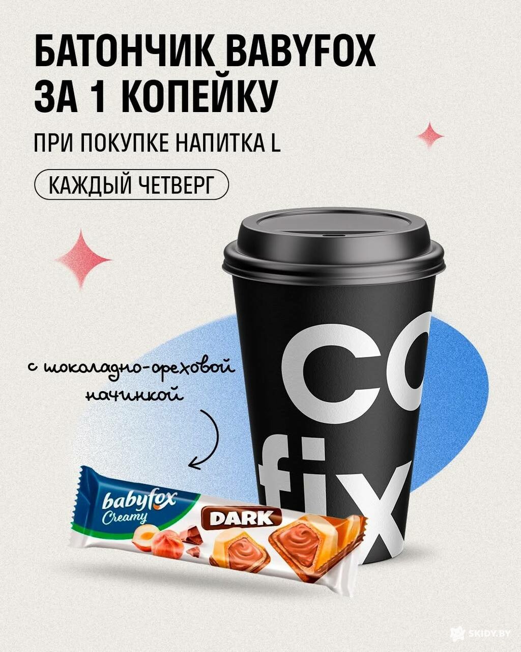 При покупке сезонного напитка L вафельный батончик Baby Fox всего за 1 копейку. Акция проходит в кофейнях Cofix только по четвергам в апреле.