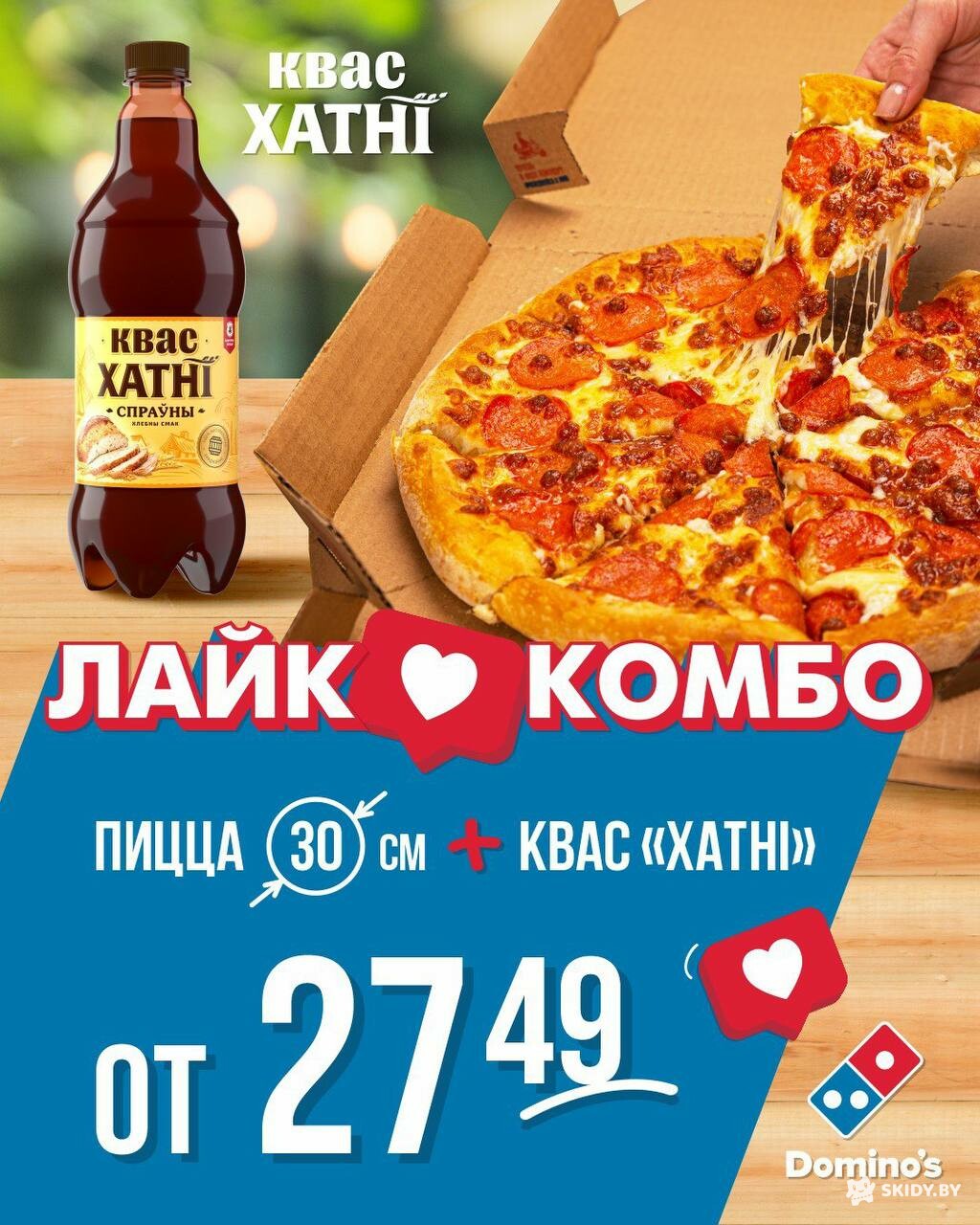 В комбо входит средняя пицца (на выбор из перечня) + квас Хатнi Спраўны (0,9л) или Квас Хатнi Цемны (0,9л).