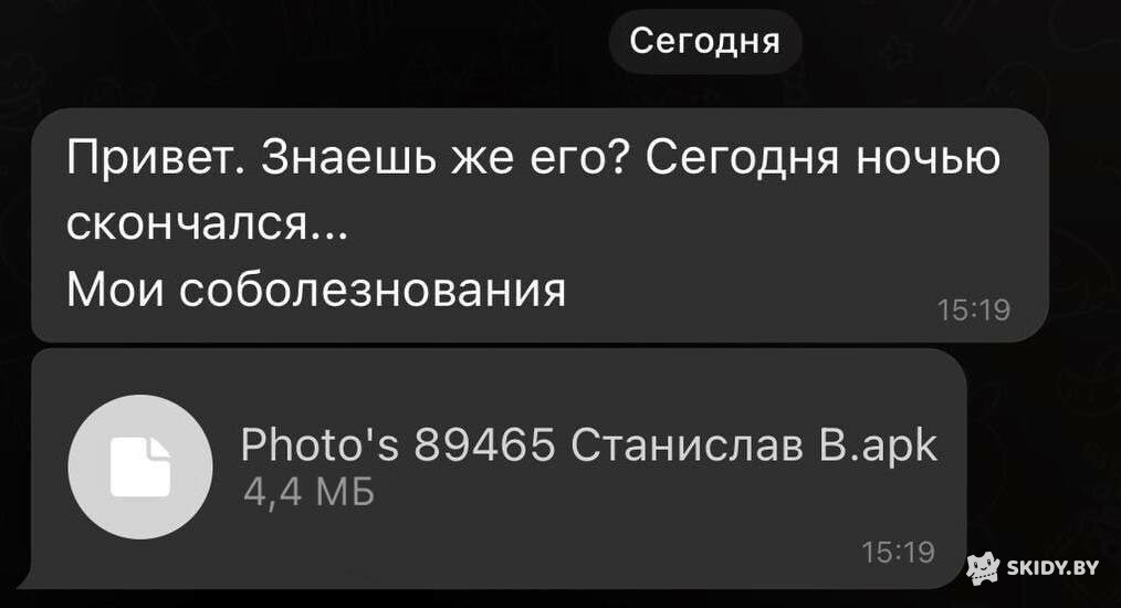 Злоумышленники отправляют сообщения о смерти знакомого человека и прикрепляют фото вредоносного APK-файла. После открытия этого файла пользователь теряет свои личные данные. Более того, после скачивания файла вирус начинает автоматически рассылаться с вашего аккаунта.