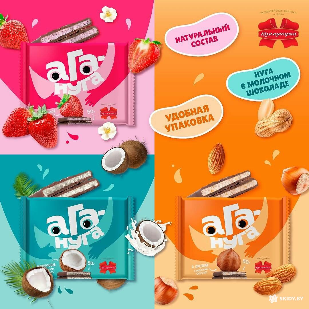 Конфеты с нугой в натуральном молочном шоколаде доступны в трёх вкусах: клубника, кокос и орешки. Приобрести их можно в фирменных магазинах «Коммунарка» и торговых сетях по всей Беларуси.