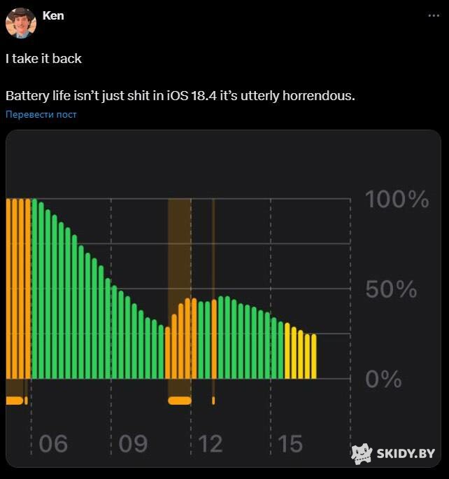 Яблочники массово жалуются: после установки апдейта батарея разряжается вдвое быстрее. Один из владельцев iPhone заметил, что емкость аккумулятора упала с 87% до 79% сразу после обновления — соцсети завалены подобными сообщениями.