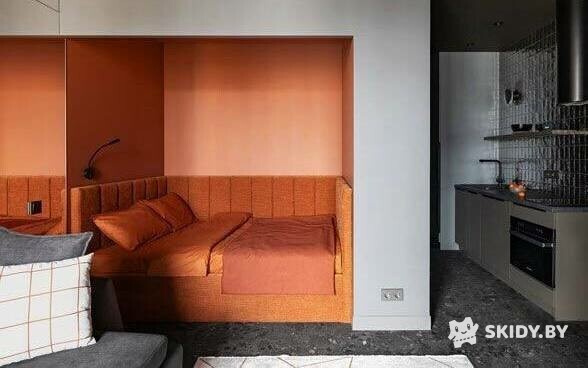 В компактной евро-минимум-студии продумана каждая деталь: здесь разместились и кухня, и гостиная, и спальня и туалет!